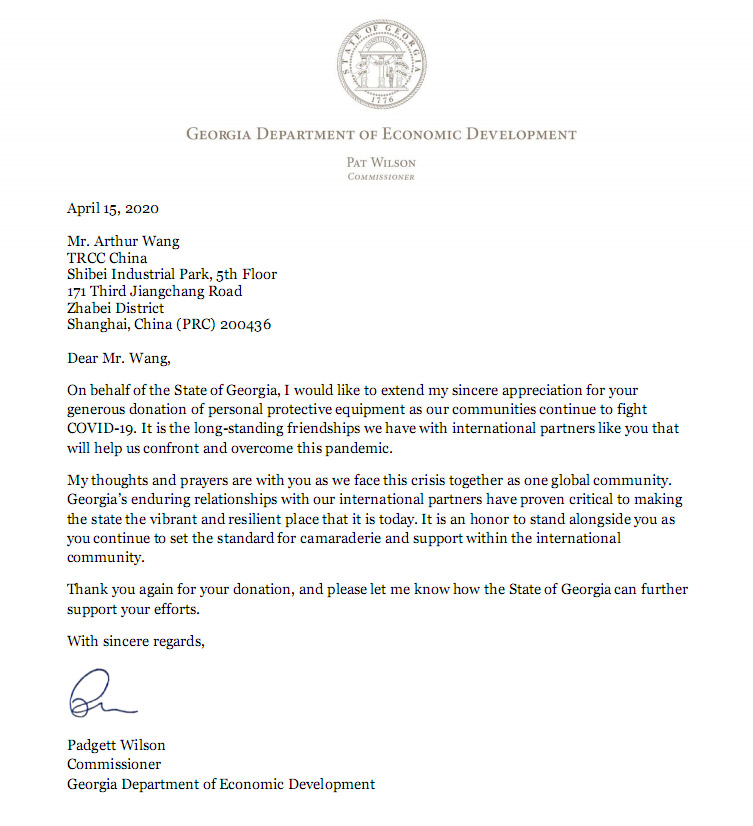 ]]>The post 美國佐治亞州經濟發展署署長致謝王閩先生的個人防護裝備捐贈 appeared first on 綈亞希西紡織橡膠(連云港)有限公司.
